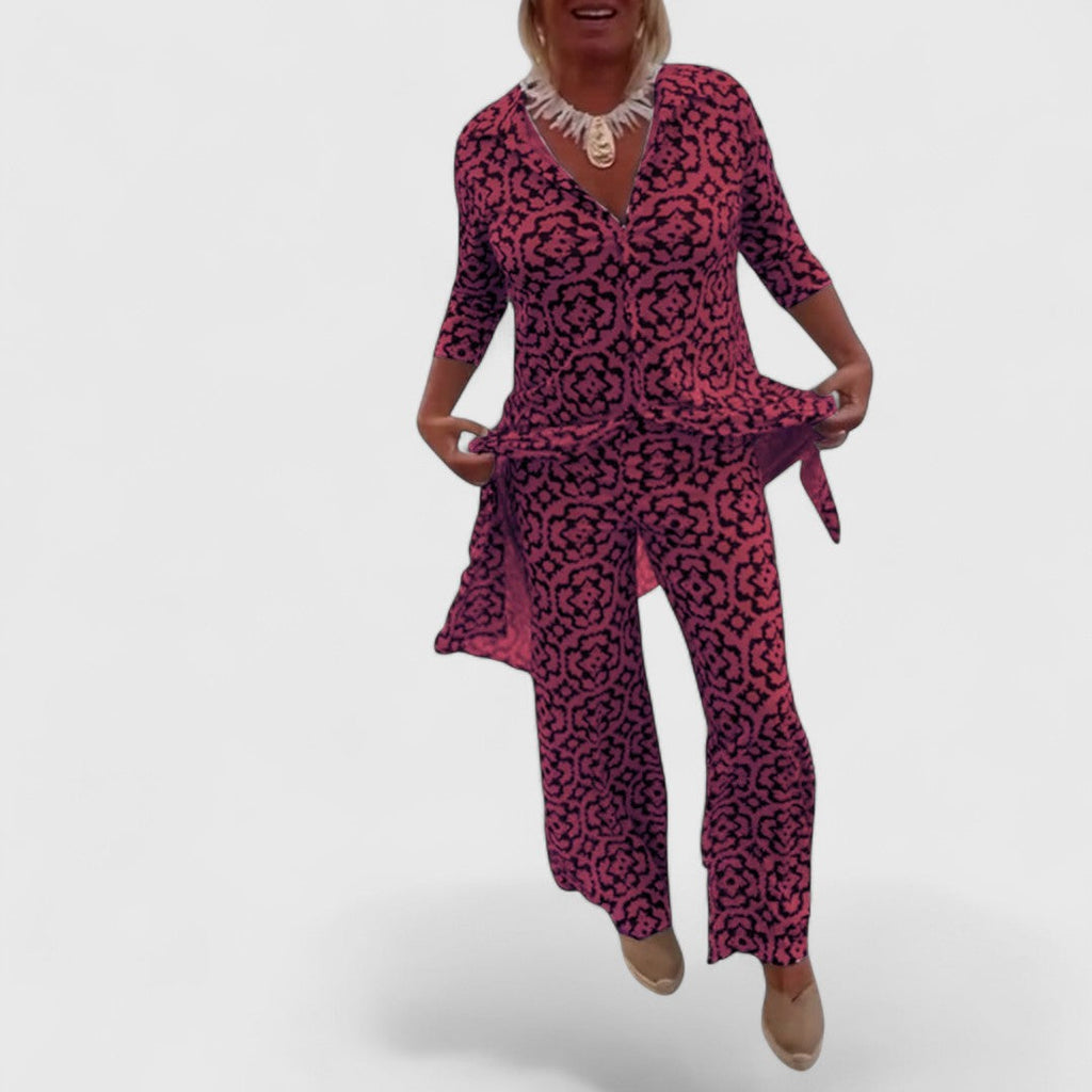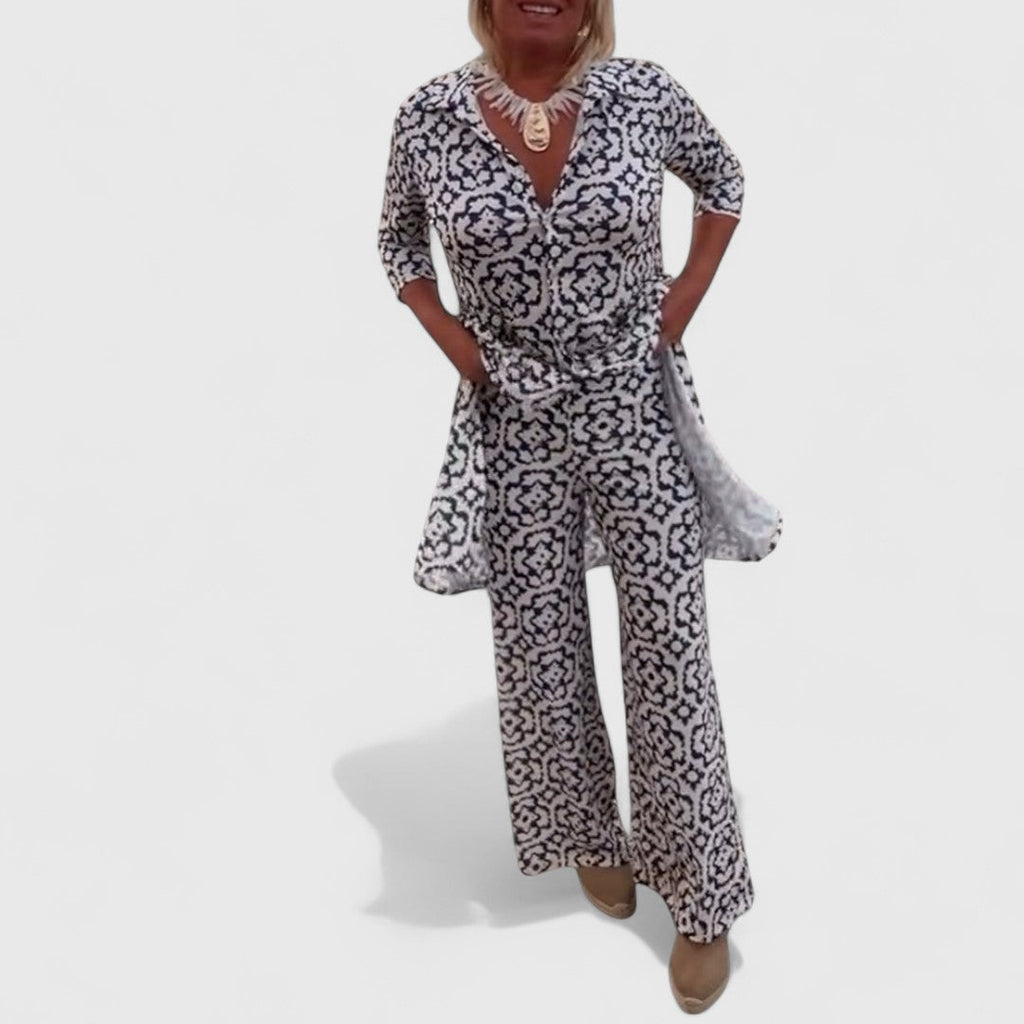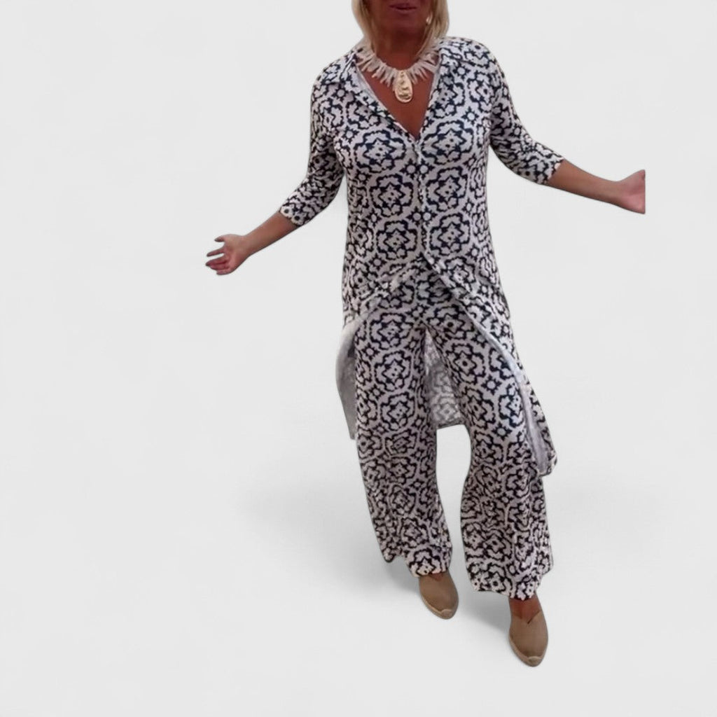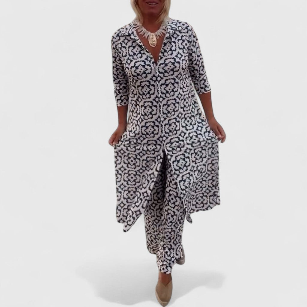 Dieses charmante Zweiteiler-Set vereint stilvollen Retro-Look mit lässiger Alltagstauglichkeit – perfekt für besondere Anlässe oder entspannte Tage mit Stil.