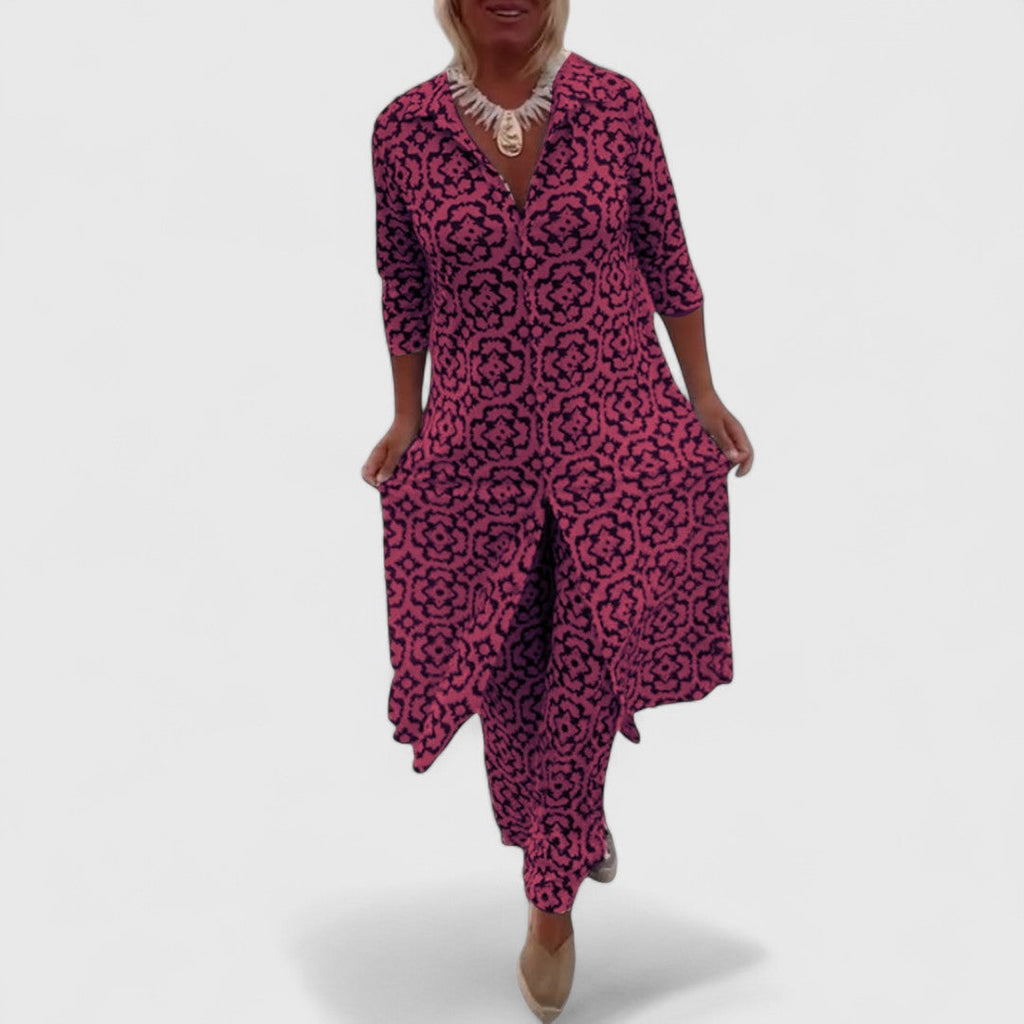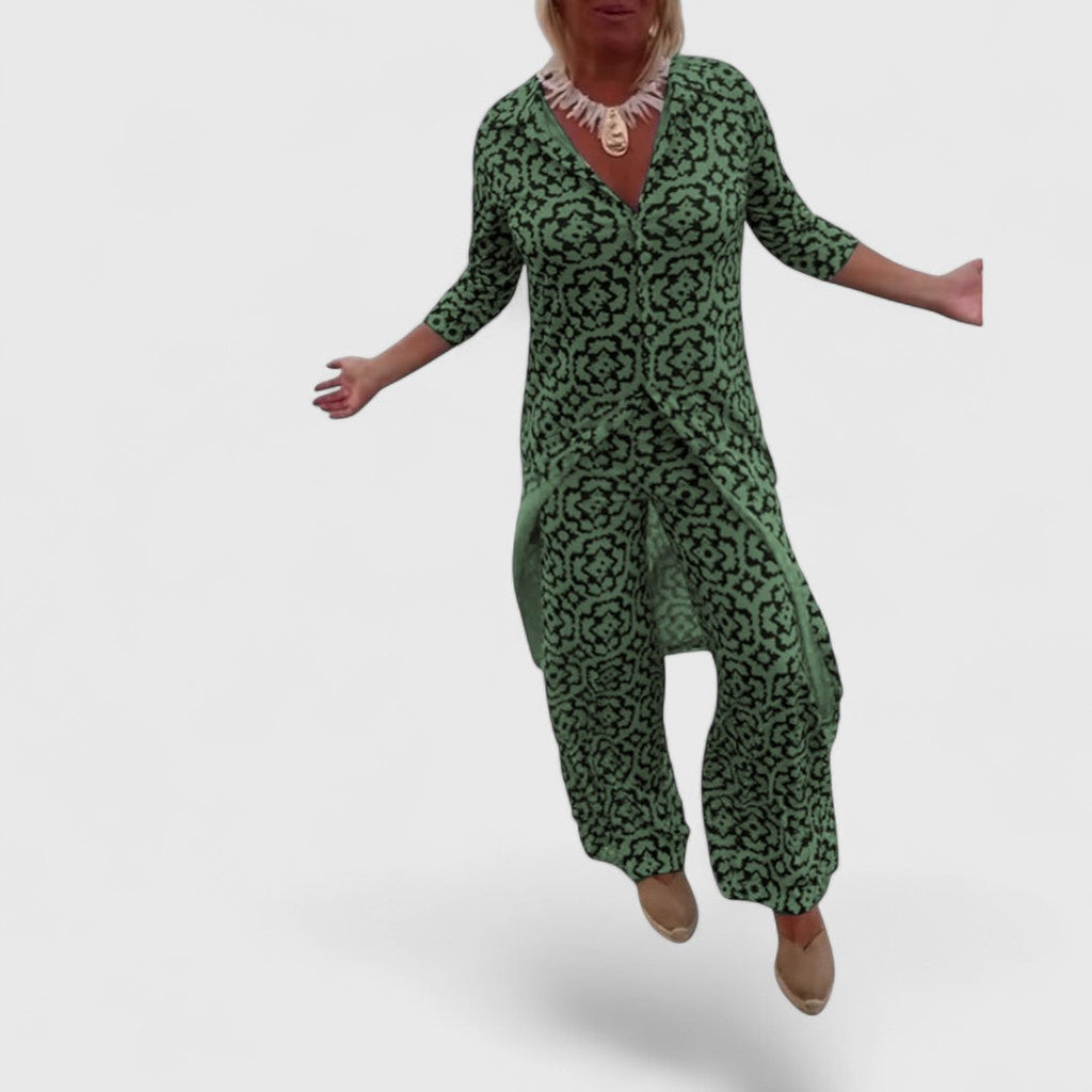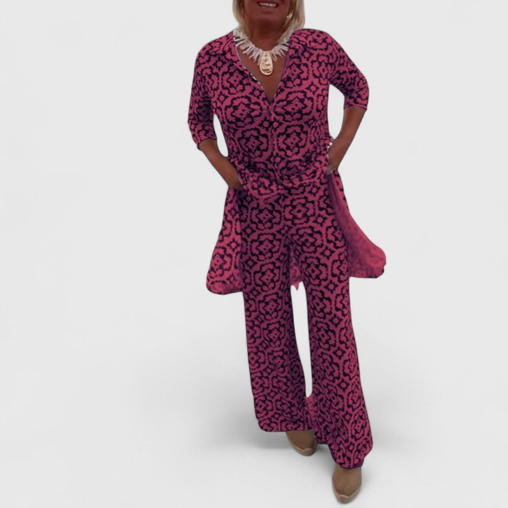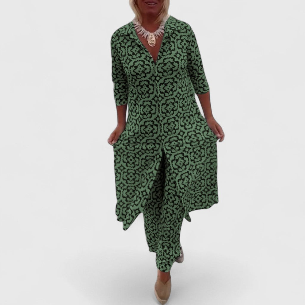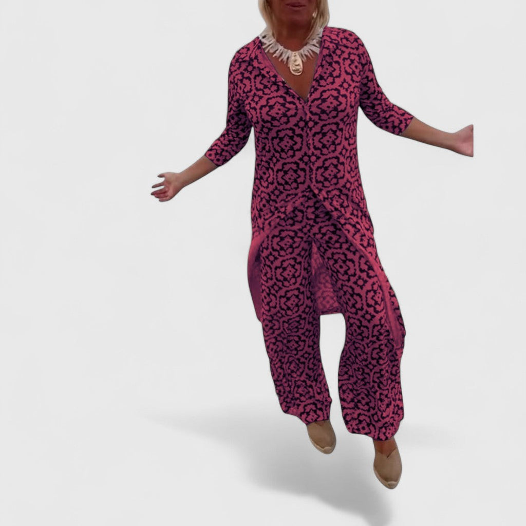 Dieses charmante Zweiteiler-Set vereint stilvollen Retro-Look mit lässiger Alltagstauglichkeit – perfekt für besondere Anlässe oder entspannte Tage mit Stil.